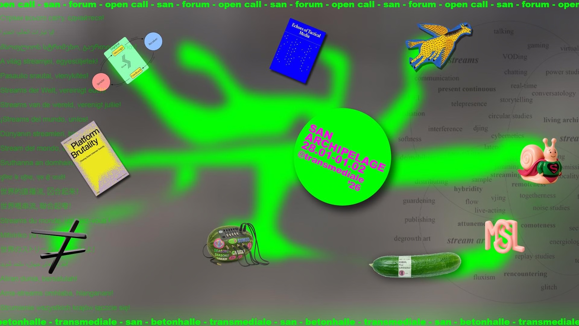 SAN Archipelago is a dispersed studio-chain at transmediale 2026: chroma-green islands in Krakow, Kyiv, Budapest, Warwick, Leeds, Munich and Vilnius, linked by converging streams and shared currents. Emerging from anti-war webcasts and solidarity media actions, StreamArtNetwork (SAN) operates as a low-budget, high-intensity carrier-net for collective presence across borders, territories and time-zones. Thinking with archipelago-drift, SAN leans into highly distributed, translocal communication: many shores, no centre; relation without consolidation.
